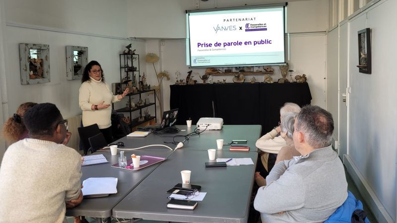 Organisation d'un atelier « Prise de Parole en Public », samedi 1er Février à l'Espace Giner dans le cadre du partenariat entre la Ville de Vanves et l’antenne Paris-Ouest de Passerelles et Compétences, animé par Cathy Touin, bénévole engagée à nos côtés depuis de nombreuses années.